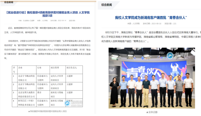 三、以开展产学研合作协同育人为抓手,大力培养学生实践创新素质。近三年,在教育部高等教育司产学合作协同育人项目申报中,我院新闻系师生共成功申报4项立项项目;教育部高校学生司供需对接就业育人项目,我院新闻专业获4项立项.新闻、广告系多次和校外企业合作。如,通过建设省级一流社会实践课程《广告文化考察+》等平台给学生创造实习实训机会。武汉镝次元数据科技有限公司、霍尔果斯火烈鸟文化传播有限公司、湖南数字经济创新产业基地均提供了资金和项目,支持我院新闻专业课程建设、豆沙包工作室建设,开展面向师生的技术培训、经验分享、接收学生实习实训,支持学生创新创业实践项目开展。同时,广告专业学生实习均在对接企业的支持下完成。