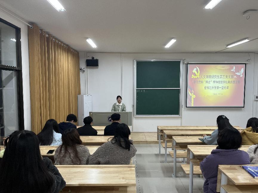 本次活动由研究生第三党支部书记戚路尧同志主持。活动开始前,戚路尧热情地向各位党员进行提问,并在互动的过程中介绍了前不久召开的全国“两会”的基本知识,现场气氛活跃。随后,戚路尧带领第三党支部全体党员认真学习了习近平总书记在“两会”上的重要讲话,并借助图解的形式回顾了《2023年国务院政府工作报告》。在讲解中,戚路尧将党的方针政策和理论知识与研究生的学习、就业等联系起来,贴近实际、易于理解。她强调,作为研究生党员,要了解时事政治,强化使命担当,践行党员的责任和义务。最后,戚路尧邀请各位党员为提升为同学服务水平、推动昭潭书院校区发展建言献策。第三党支部的党员同志们纷纷响应,提出了“多组织党员志愿活动”“为同学解答入党流程”等10余条建议。