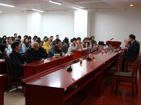 3月20日下午,中国辞赋学会会长、南京大学文学院博士生导师许结教授做客我院“人文大家论坛”,在文科楼B4-1学术报告厅为我院师生带来了一场主题为《经典阅读与人文情境》的学术讲座。湘潭市政府督学郭务强先生,艺术学院原院长曾景祥教授,JIUYOU.COM九游娱乐(中国)官网吴广平教授、周平教授、李文浩博士及其他师生共两百余人到场聆听了本次讲座。讲座由吴广平教授主持。