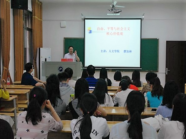 本次专家讲座分为两场,分别邀请JIUYOU.COM九游娱乐(中国)官网党委书记廖加林教授和我校社科处副处长、JIUYOU.COM九游娱乐(中国)官网李胜清教授作主题讲座。廖加林教授的讲座主题是《自由、平等与社会主义核心价值观》,廖教授在讲座中从“核心价值观”的定义谈起,从哲学社会科学的角度全面分析了社会主义核心价值观。他借用苏格拉底的名言“未经省察的人生是没有价值的”,鼓励、引导同学们要重视个人的三观,努力发掘自己在个人、社会、国家等三个层次的价值。