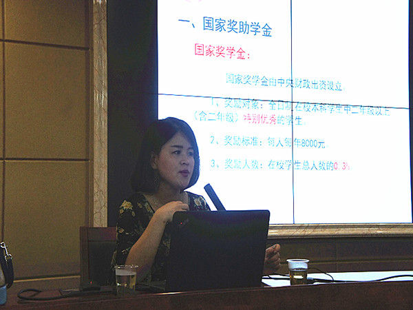 会上,邱靖老师从大学生资助体系入手,详细讲解资助体系的奖、贷、助、补、免五大内容。关于奖,她结合我校现有政策,对国家奖学金,国家励志奖学金,国家助学金的相关情况作了细致解说,涉及各类奖学金的申请条件、奖励标准、奖励对象、奖励比例等方面;贷,即国家助学贷款生源地贷款,邱靖老师对国家助学贷款、注意事项、做好还贷工作和违约后果及不良影响做了详细介绍。她指出,为了约束恶意拖欠等违约行为的发生,国家助学贷款管理已被纳入到个人征信系统中,个人的身份证号码、学历、工作单位、家庭地址、借款金额、还款期限等已经被依法采集进了个人信用信息基础数据库。她说:“诚就是内诚于己,信就是外信于人。学生的借贷行为与个人诚信关系很大,对个人的信用和以后的社会生活影响很大。”;助,勤工助学、寒衣发放等给予学生一定的帮助;补或免,如学生家庭出现变故,经济特别困难,无法生活等情况下,学校给予学生临时困难补助和学费减免。最后邱靖老师转换视角,回归感恩。以罗斯福和霍金的故事为例解读感恩自己、感恩他人。“一个可思考的大脑,因此我们享受这诸多帮扶政策的同时更应该怀有一颗感恩之心,回馈帮己之人。”她说到。