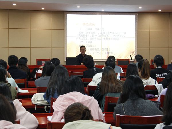 刘教授从禅的源头开始讲起,他运用形象的比喻阐释了禅学内部的种类差异,告诉我们,“小乘禅”是一个人的修行,而“大乘禅”是用“般若”的思想普度众生。而大乘佛教在中国流行的原因很大程度上在于其‘菩萨道’的思想与儒学‘己欲达而达人’的思想相契合。另外,刘教授用“禅宗之禅”的思想表明禅学提供了人们看世界的新视角,即在穿衣吃饭、挑水担柴等生活琐事中也可体悟禅意。在禅学的拓展方面,刘教授又从“士大夫禅”、“生活禅”、“人间佛教”三个角度对其进行深度解析。