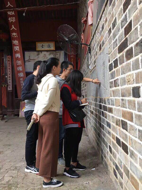 当日下午,考察团驱车前往竹中村实地考察李家宗祠以及祠堂内现存的一座清咸丰年间的古戏台。王奕祯老师结合现场为同学讲解了古戏台的相关知识,张晓燕老师则带领同学将戏台碑文逐一抄录下来,作为后续科研的宝贵资料。随后,考察团又马不停蹄赶往平都村,考察胡氏思荣公祠堂。祠堂内保留有一座清道光年间的古戏台。刘奇玉老师结合碑文对戏台和宗祠的概念做了进一步阐释,大大拓宽了随行同学的知识面和视野。