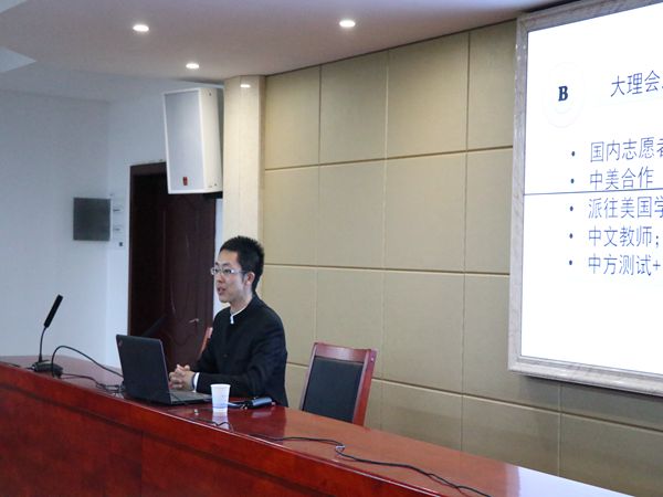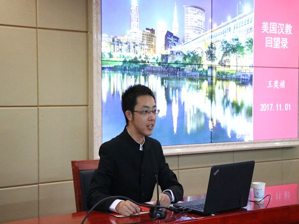 讲座伊始,王博士介绍了美国汉语教学项目,诸如汉语教学志愿者、国家公派汉语教师、大学理事会志愿者等项目,并简要说明了各项的流程,以自身通过的国家公派汉语教师项目为例讲述了参与选拔、培训、面试的经历。“我在克利夫兰的工作内容主要分为教学工作和文化推广工作两部分。”介绍日常工作的同时,他还指出了中文教学在美国的一些现实困境,面临生源少等问题,中国文化的推广是一个艰巨而长远的过程。