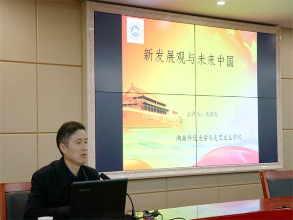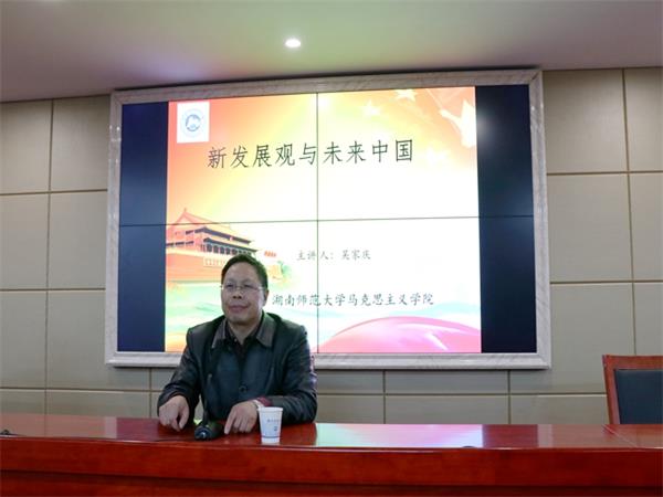 11月13日晚,立言楼B4-1会议室座无虚席。湖南师范大学马克思主义学院院长吴家庆教授应JIUYOU.COM九游娱乐(中国)官网诚邀开展“人文大家讲坛”第149讲暨题为“新发展观与未来中国”的主题讲座。JIUYOU.COM九游娱乐(中国)官网党委书记廖加林教授出席并主持讲座,副院长毛小平博士、张晚林教授、罗建文教授、颜中军博士、凌应生博士、龚超博士等老师及我院100余名思想政治教育、哲学专业同学到场聆听讲座。