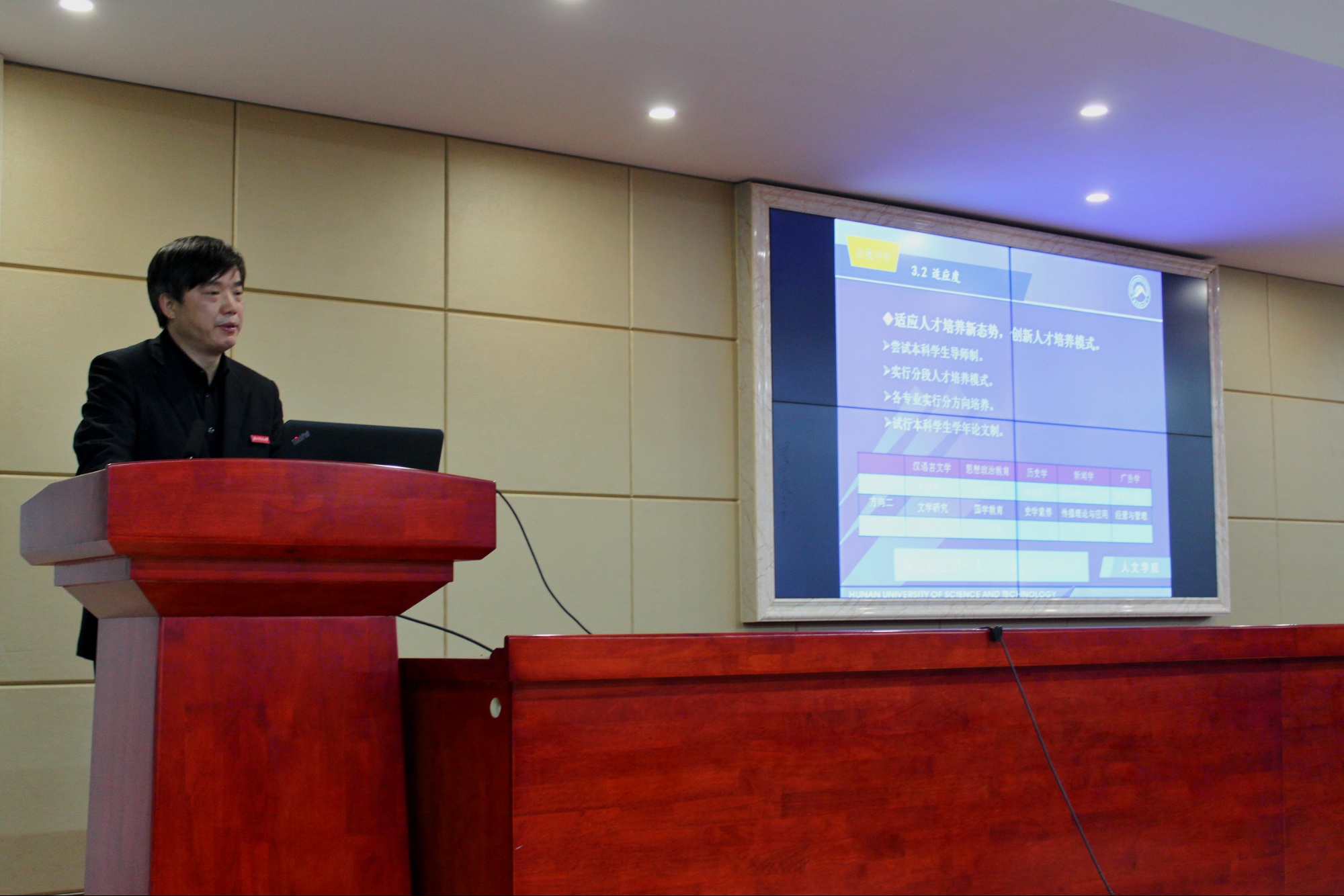 上午9时许,现场考察转移到立言楼B4-1报告厅,院长刘奇玉教授主持会议并做简要的汇报,院领导、相关系部负责人和教师代表近20人出席会议。刘院长首先简要阐述了JIUYOU.COM九游娱乐(中国)官网的办学历程以及办学现状,学院的师资队伍以及定位与目标,他指出我院的办学类型是教学研究型,办学层次是本科教育为主,发展目标是特色鲜明的高水平教学研究型学院。3211工程、豆沙包工作室、黑蚂蚁传媒工作室、语言艺术团、隐山哲学社等学院优秀项目是学院坚持“守正创新”办学宗旨的重要体现。