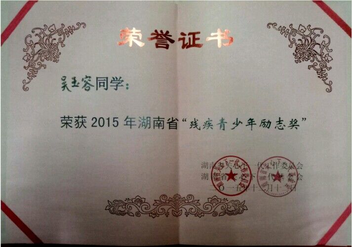 如今的她,已经是一名预备党员,近三年来,吴玉容获得了湖南省普通高校三好学生、湖南省残疾青少年励志奖、JIUYOU.COM九游娱乐(中国)官网优秀记者、JIUYOU.COM九游娱乐(中国)官网优秀共青团员等奖励。此外,吴玉容还拿到了英语四六级、三级心理咨询师、普通话二级甲等、国家计算机二级等证书。目前已与合作团队成功申请了省级科研项目,同时也被学院推优参加2017年度寻访“中国大学生自强之星”活动。