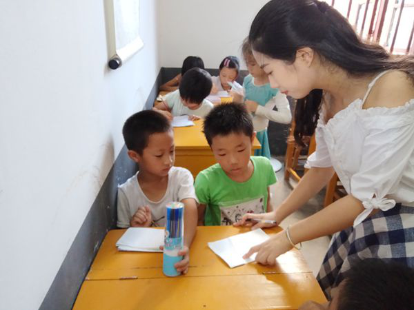 烈日下孩子们的脸颊上晕开一层层淡淡的腮红,但掩不住他们对我们的热情和期待,来到荷塘小镇的第一个下午我们便展开了准备已久的支教活动。“坐观垂钓者,徒有羡鱼情”,志愿者银文在课堂上为大家讲述的是诗人孟浩然求官的坎坷经历;“学而不思则罔,思而不学则殆”,志愿者伍园园在课堂上为大家讲述的是孔子的学习方法;志愿者李锦新则教着六年级的孩子们如何换算古代的货币......学习从来都是一件辛苦的事,教室如摆在火焰上的一架蒸笼,孩子们的汗水混着墨汁渗在作业本上,但脸上却洋溢着幸福的表情,仿佛在告诉志愿者们:“读书是一件快乐的事,你们便是给我们带来快乐的人”。