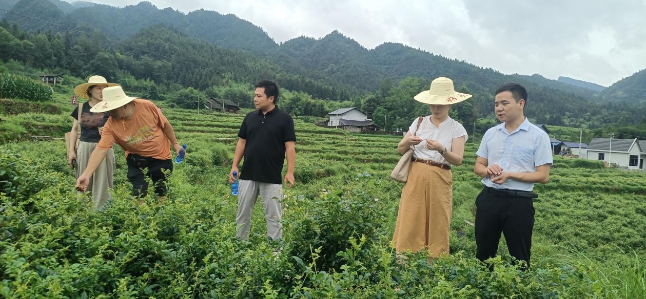 考察河坝溪千亩莓茶示范基地(下图前排中为毛坝乡党委副书记、乡长张显杰)