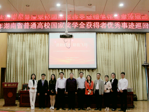 5月21日,湖南省普通高校“资助成才,助我飞翔”国家奖学金获得者优秀事迹巡回报告会第三场于湖南工业大学崇德楼一楼报告厅举行。湖南省学生资助管理中心副主任杨昌江,湖南工业大学党委委员、副校长李可兴,湖南铁路科技职业技术学院副院长陈彬,湖南省学生资助管理中心主任科员谭莉等出席会议。JIUYOU.COM九游娱乐(中国)官网由JIUYOU.COM九游娱乐(中国)官网赵华老师带队代表学校与会。