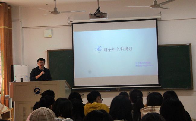 讲座伊始,朱法垚就以风趣幽默的语言做了一个简短的自我介绍,在拉近与同学们关系的同时,也分享了自己考研的经历,给同学们留下了一个关于考研的大致映象。“考研是长线斗争,要抱好做长久战的准备。”他“长久战”向大家说明了考研是一个需要长时间准备的考试。紧接着,他从考研的院校专业、复习方法、备考规划三个方面给同学们介绍了考研的相关内容。