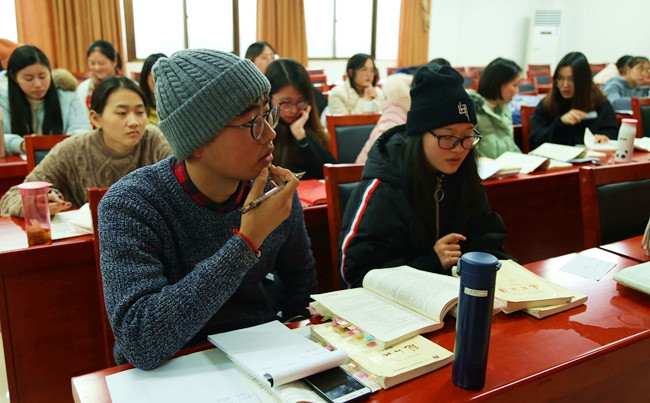 三点的钟声一响,古代汉语答疑会准时开始。会议伊始,尹戴忠教授说明了顺利通过研究生考试的第一要素——心态。“考试时不要想太多,尽力去答,只要熟悉书本,我相信你们一定没有问题!”其后,她向同学们强调了几个在研究生考试中重要的考点:简答题的答题方法,以及翻译的要点等等。同学们时而抬头,神情严肃而认真,聆听老师的讲解;时而低头,笔尖沙沙地在书本上划过,记录下重要的考点。