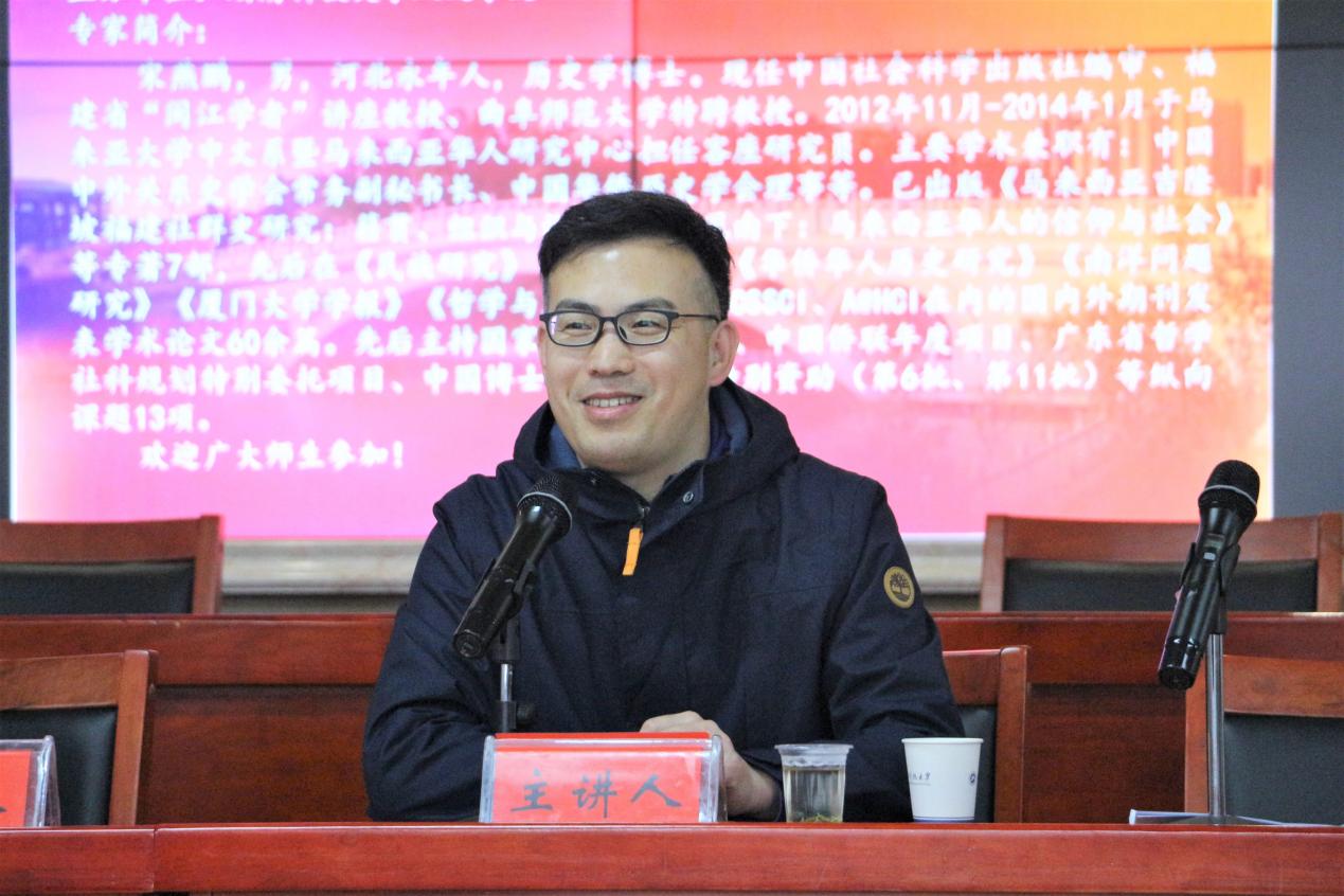 宋燕鹏,男,河北永年人,历史学博士。现任中国社会科学出版社编审、福建省“闽江学者”讲座教授、曲阜师范大学特聘教授。2012年11月-2014年1月于马来亚大学中文系暨马来西亚华人研究中心担任客座研究员。主要学术兼职有:中国中外关系史学会常务副秘书长、中国华侨历史学会理事等。已出版《马来西亚吉隆坡福建社群史研究:籍贯、组织与认同》《华风南下:马来西亚华人的信仰与社会》等专著7部,先后在《民族研究》《史学月刊》《华侨华人历史研究》《南洋问题研究》《厦门大学学报》《哲学与文化》等期刊上发表学术论文60余篇。先后主持国家社会科学基金、中国侨联年度项目、广东省哲学社科规划特别委托项目、中国博士后科学基金特别资助(第6批、第11批)等纵向课题13项。