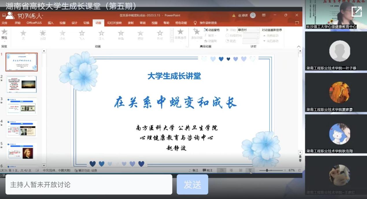 5月16日晚7点,由湖南省高校大学生心理健康教育研究会、湖南省社科普及基地主办,湖南工程职业技术学院承办的第五期湖南省高校大学生成长讲堂在腾讯会议线上开展,南方医科大学心理健康教育中心主任赵静波教授受邀作《在关系中蜕变与成长》专题讲座,全院研究生参与线上观看。